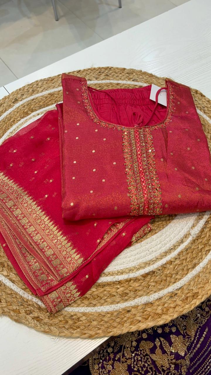 This exquisite deep red suit set radiates festive elegance and timeless charm. Crafted from a luxurious silk-textured fabric, the kurta is adorned with delicate golden zari motifs and intricate bead and sequin embroidery along the neckline and front panel. The subtle shimmer enhances its regal appeal, while the tie-up dori at the back adds a graceful finishing touch. Paired with a matching dupatta featuring rich Banarasi-inspired zari borders, this ensemble is perfect for weddings, festive celebrations, and traditional gatherings — effortlessly combining sophistication with a touch of royal allure.